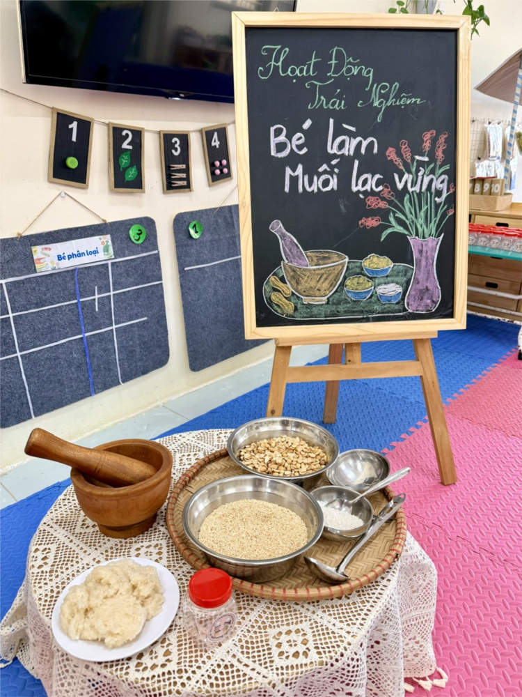 Trong hoạt động, các cô giáo đã giới thiệu cho trẻ những nguyên liệu quen thuộc để làm muối lạc vừng như: lạc rang, vừng rang và một chút muối. Các bé được quan sát, tìm hiểu về đặc điểm của từng nguyên liệu, đồng thời biết thêm đây là món ăn dân dã, gần gũi trong bữa ăn hằng ngày của gia đình Việt Nam.