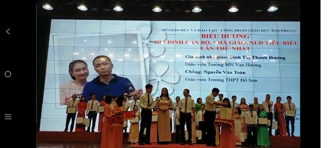 Rất vinh dự cho trường Mầm non Vạn Hương có gia đình nhà giáo Đinh Thị Thanh Hương - giáo viên trường mầm non Vạn Hương và chồng là nhà giáo Nguyễn Văn Toàn - giáo viên trường THPT Đồ Sơn được biểu dương là gia đình nhà giáo tiêu biểu. Sau đây là những hình ảnh đẹp của buổi biểu dương: