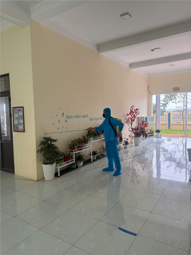 Công tác phun thuốc được thực hiện tại các khu vực: phòng học, hành lang, khu vệ sinh, sân chơi và khuôn viên xung quanh trường. Quá trình phun thuốc được triển khai đúng quy trình, đảm bảo an toàn, sử dụng thuốc diệt muỗi theo quy định của ngành y tế, không gây ảnh hưởng đến sức khỏe của trẻ, cán bộ, giáo viên và nhân viên nhà trường.