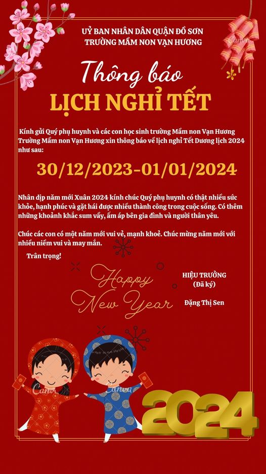 Nhà trường trân trọng thông báo đến Quý phụ huynh lịch nghỉ Tết Dương Lịch 2024 của các con như sau :
