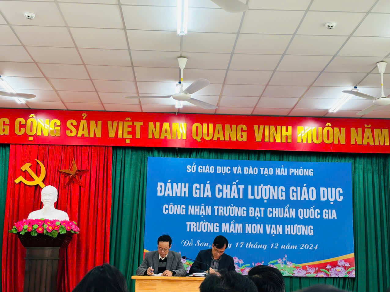 Thành phần tham dự và tiếp đoàn có Ông Phạm Hoàng Tuấn – Phó chủ tịch Ủy ban nhân dân quận Đồ Sơn; Bà Nguyễn Thị Ước - Trưởng phòng Giáo dục và Đào tạo quận Đồ Sơn; Bà Lê Thị Hường – Hiệu trưởng Trường MN Vạn Hương và Hội đồng tự đánh giá chất lượng giáo dục Trường MN Vạn Hương.